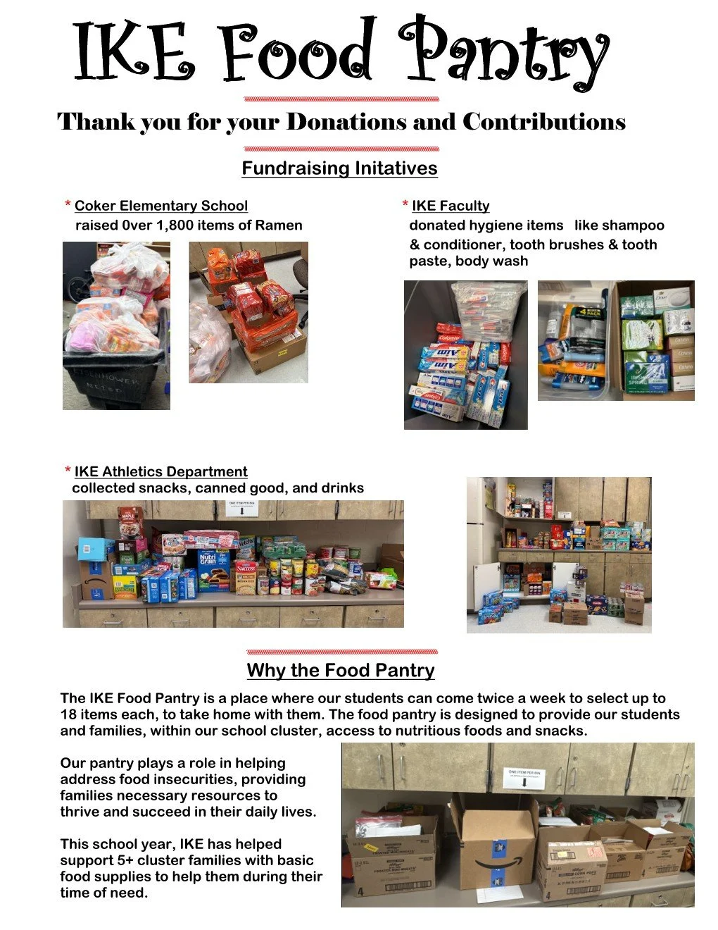 IKE's Food Pantry is in need of some volunteers to help make sure all of our students in need are served. The food pantry helps support IKE students by providing free groceries and toiletries needed beyond school hours. Your help is greatly needed and greatly appreciated.